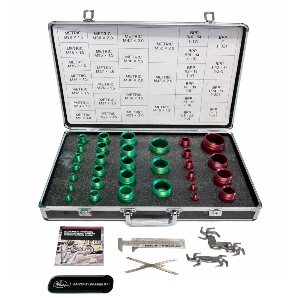 Deluxe Metric and BSP Thread ID Kit: International Thread identification for male and female fittings includes Metric thread sizes from M8 × 1.0 through M52 × 2.0, as well as BSPP sizes from 1/8-28 through 2-11. Gates part number 7369-0015 (70264)